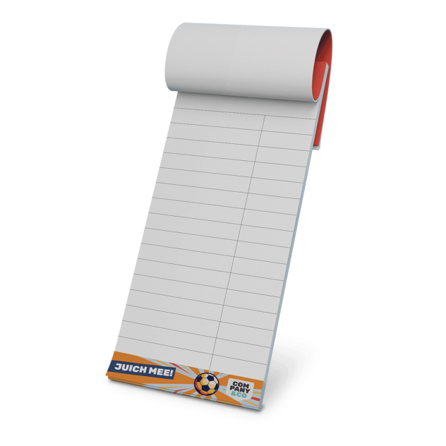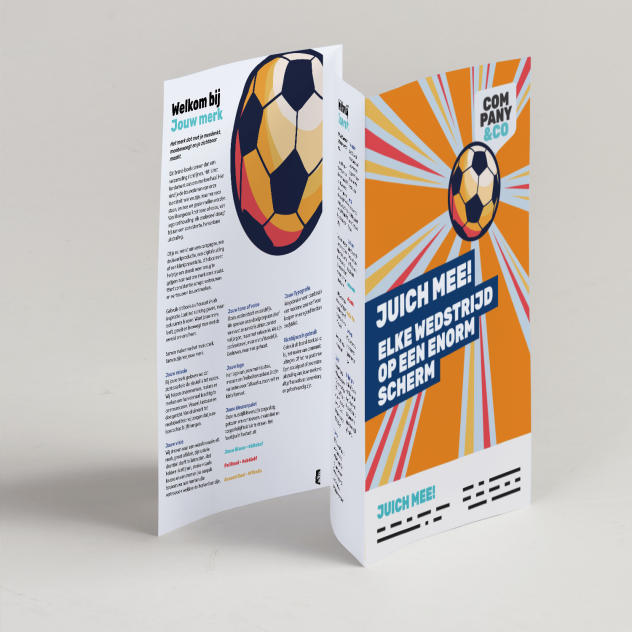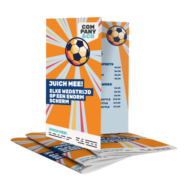 Hoe leuk het voetbal ook is, er wordt niet alleen maar voetbal gekeken. Een wedstrijd kan niet zonder een hapje en een drankje. Maar wat heb jij allemaal te bieden? Met een eigen menukaart laat je eenvoudig zien wat jouw klanten bij jou kunnen bestellen. En om de aankleding van de tafel compleet te maken, zorg je voor zelf ontworpen placemats. Uiteraard helemaal in voetbalstijl, zodat de sfeer er direct goed in zit.